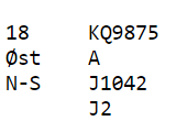 Nord har unektelig en god hånd, men kun 11 hp. En slik 6-4 fordeling er dog veldig spillesterk. Det hadde vært en klart sterkere hånd om nords sidefarge hadde vært sterkere, for eksemepel om han satt med ruter ess i stedet for hjerter ess. Det er klart at syd må ha nokså riktige kort for å kunne dekke opp nok av alle nords potensielle minortapere. Om syd har helt feil kort, for eksempel AJxx - KQJx - Jxx - AK (19 hp) er det bet i 5 spar! Men nord kan antagelig ikke være så pessimistisk. Mange rett og slett sa 4 grand som Key Card Blackwood. Kanskje en bedre melding er 5 hjerter som cuebid for å fortelle at ingen minorfarge er stoppet med nord sine kort. Da vil syd melde slemmen. Om nord velger å spørre med 4 grand får han vite om to Key-Cards, og da må han som en konsekvens også melde slem. Slik så hele spillet ut: