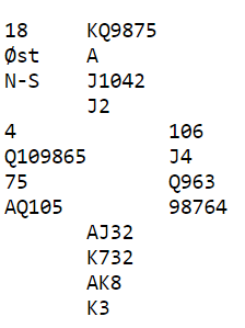 Etter at denne artikkelen ble lagt ut her i bloggen kom jeg på at 4 spar selvsagt kan betes av Ø/V om vest finner hjerter ess i utspill. Han fortsetter med hjerter til østs K-J, og idet det tredje hjerterstikket tas kaster vest sin single kløver. Så tas betestikket med kløver til stjeling - et vakkert motspill!