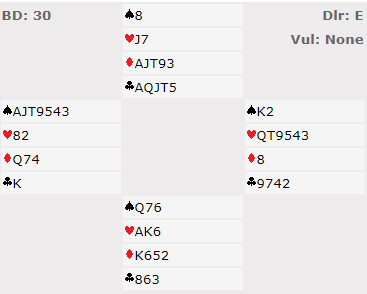 Det er tre muligheter: melde fire i en minorfarge (og da stå i fare for å melde den fargen makker ikke har tilpasning i), si 4 grand som begge minor (som er ganske hardt), eller gamble 3 grand! Jeg gikk for utgang og sa 4 grand. Da trauet kom tilbake gjennom skjermen var makkers melding temmelig overraskende: 6 grand! Noe måtte være galt, for hvorfor meldte hun ikke over 3 hjerter? Slik så hele spillet ut: