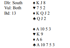 Uten motmeldinger fra motparten får du som syd hjerter 6 i utspill (fjerde høyeste) fra vest mot 3 grand og vinner med kongen over øst sin knekt. Hvordan spiller du (husk det er parturnering). Siden det nå er lagturnering på gang i Philadelphia (den prestisjetunge VANDERBILT starter mandag) kan du analysere denne utgangen også om det hadde dreid seg om lagkamp (IMP beregning) også.