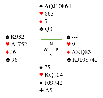 Syd valgte ikke unaturlig spar 8 i utspill, og det gikk dame, ess og stjeling. Spillefører tok for ess og konge i hjerter, og syd kastet kløver konge. Så fulgte kløver 2 fra øst, og husk at østs kort er skjult! Husk også at syd hadde hørt makkeren støtte til 5 kløver. Syd syntes det så ut som en god ide å få nord inn for å få ruter gjennom spillefører, og la kløver 3! Dermed vant kløver 4 stikket, og spillefører kunne kaste en ruter på spar konge før det kun ble to rutertapere. Elleve stikk og +650 til Ø/V!