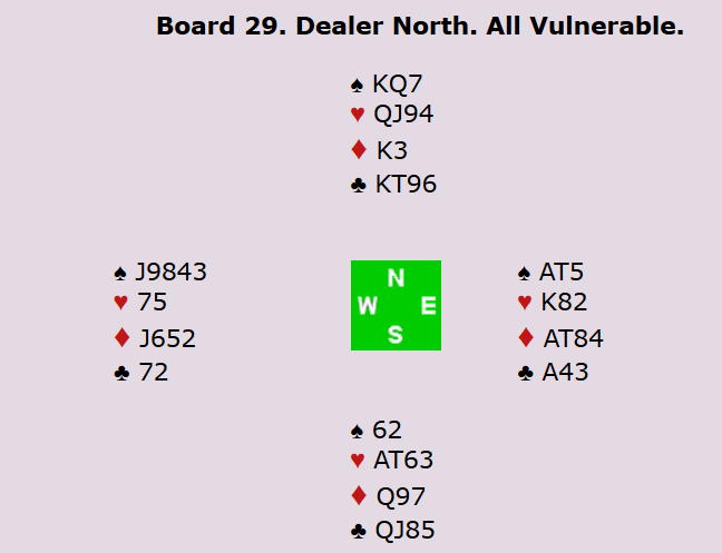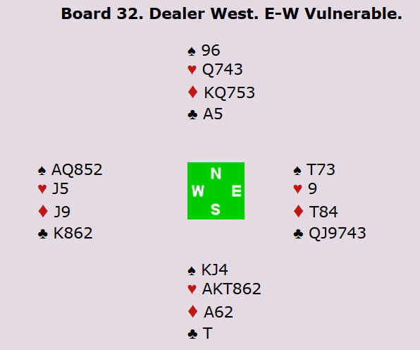 Her ble Ann Karin spillende 4 hjerter i nord etter å hå oppvurdert til en 15-17 grand med de fine mellomkortene. Etter at Marianne spurte i Stayman og fikk høre om hjerterfarga, hoppet hun til utgang. Med hjerter konge på rett sted, var tre ess alt svenskene kunne få for. En litt hardmeldt, men fair utgang som man gjerne ønsker å være i.
