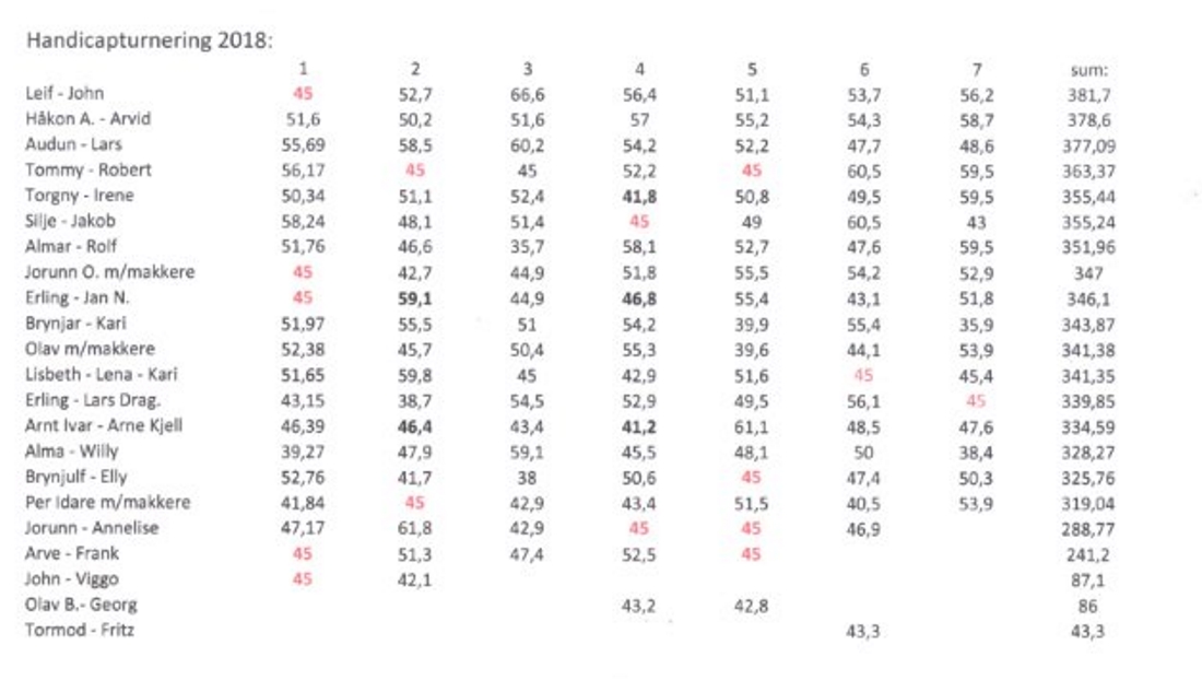 16 par deltok siste spillekveld av Handicap-turneringen 2018 i Sortland BK. Vinnere ble Torgny Nilsson (bildet) - Irene Dragland foran Tommy Elde - Almar Olsen på andre og Håkon Arild Bergsrud - Arvid Bræck på tredjeplass. Resultater Resultater uten handikap Sammenlagt ble turneringa vunnet av Leif Hagen - John Solum foran Håkon Arild Bergsrud - Arvid Bræck på andreplass og Audun Aanes - Lars Liset på tredjeplass. Sluttresultat (etter 7 kvelder)