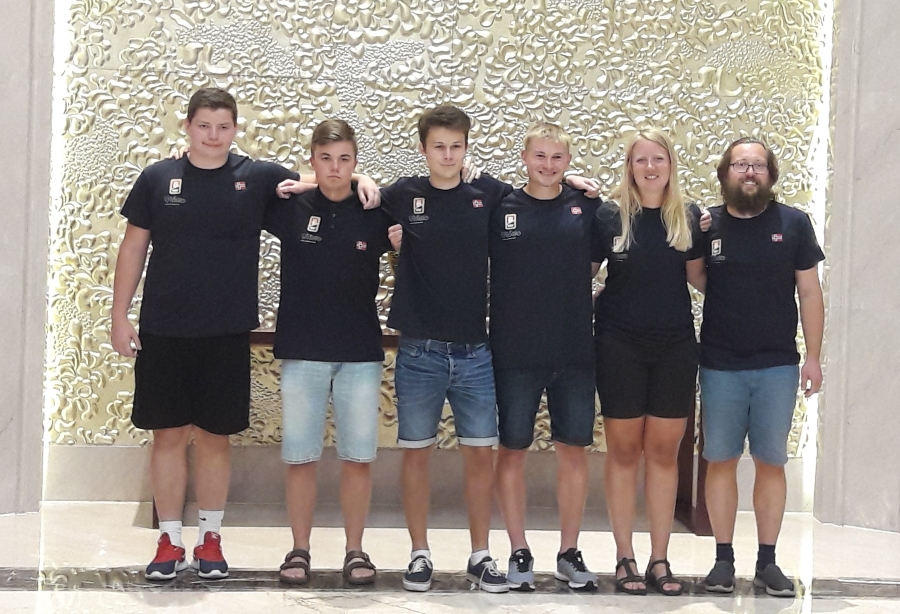 Norges U21-lag før kveldens åpningsseremoni: Fra venstre Arne Osnes Devik (16), Markus Lund (18), Simen Sørlie Helgeby (19), Carl- Otto-Curran (19), coach Liv Marit Grude og NPC Kristian Barstad Ellingsen.