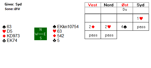 Du spiller utgang i spar på vests hånd etter at syd har åpnet med 1 hjerter (11-15 hp og minst 5-korts hjerter), makker har meldt inn 2 ruter og nord har støttet til 2 hjerter.