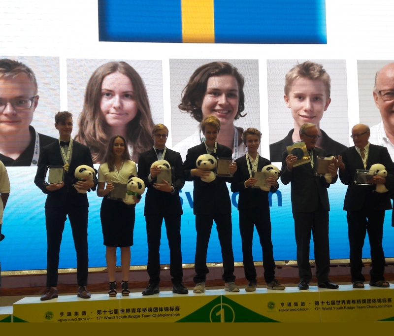 Sveriges U21-lag hadde en ledelse på 25 IMP etter gårdagens fire sett i sin finale mot Israel. Israelerne hadde et solid førstesett i dag og var i ledelsen med åtte IMPs margin idet spillerne gikk til lunsj i dag. Det var lite IMP i sving i siste sett, men Sanna Clementsson bidro sterkt til å sikre seieren for svenskene da hun åpnet med en ellevepoenger og 4-4 i major. Da kom hun og makker Alexander Sandin i utgang, mens israelerne stoppet i delkontrakt. Da alle spillene var sammenlignet viste resultattavla at svenskene hadde slått Israel 118-112, og dermed sikret VM-gull nummer to for Sverige. Rett og slett imponerende av vårt broderfolk!