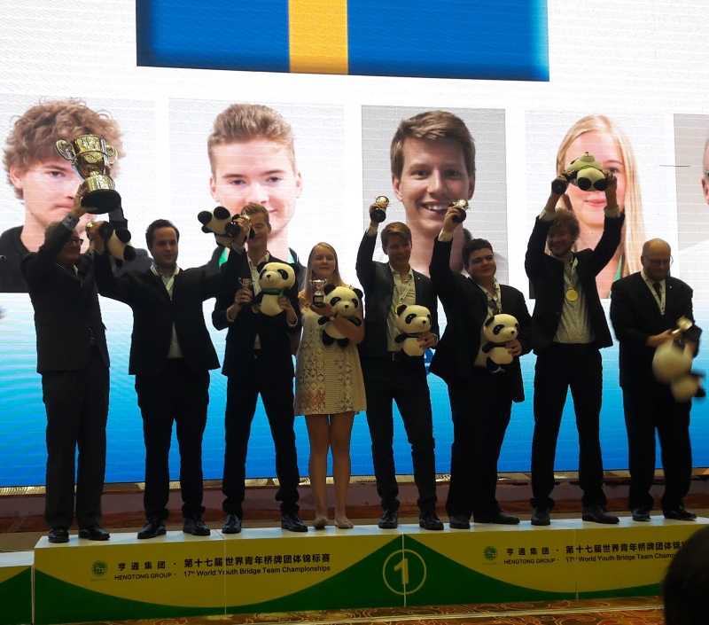 I kveld var det premieseremoni i Wujiang. Det var Sverige som fikk mest heder for sine to gull, i henholdsvis U21- og U26-klassen. Men det var også norske representanter på scenen. U21-laget skulle nemlig motta applaus for sin seier i B-finalen i Board-a-match-turneringa. Det ble ingen medaljer denne gang, men hver av spillerne fikk en pandabamse som et minne om innsatsen I BAM og turen til Kina. Det var godt med en opptur på tampen av oppholdet for U21-laget.