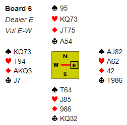 Jeg var selv i 6 kløver og låste meg kanskje litt på analysen av denne ruterkombinasjonen. Det er teknisk sett to muligheter, enten kongen i saks, eller J-10 (--) foran. For å få prøvd begge deler må det spilles to ganger ruter mot øst, den første med liten til nieren som en annen dag kunne ha dratt kongen fra syd, og om ikke det fungerer er det en sjanse til, en ruter til fra vest og finesse med damen. Så vest må ha to inntak til å spille ruter for å få prøvde begge sjansene, og det finnes, kløver dame og spar gir overganger til vest.