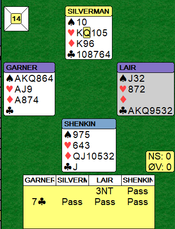 Der Tor og Geir satt N/S åpnet øst med 3 grand, og uten å vite noe om den fantastiske tilpasningen sa vest bare 4 spar. Det var tolv enkle stikk i spar, og ser ut som det kan bli tretten, men siden kløveren sitter så skjevt får ikke spillefører både kastet sine hjertere og trumfet nok rutertapere. Spillefører fikk tolv stikk, +480.