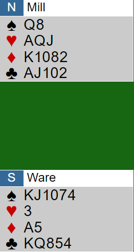 GUMBY hadde som sagt ledelsen i kampen, men bare med noen få IMP. Så da spillet skulle spilles ved det andre bordet måtte N/S melde slemmen, hvis de ikke gjorde det så ville det bli finaletap for dem.