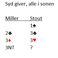 Knut åpnet med 1 hjerter, pass fra Tone Annette og 2 hjerter fra May Liss (V) som Øst etter pass fra Nord løftet til 4 hjerter. Det var normal kontrakt bortsett fra to par som fightet på 5- trinnet i minor, 5 kl x og 5 ru x. Disse gikk henholdsvis 3 og 2 bet men billig stamp og utgang imot står.