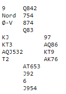 Syd kan jo like godt ha spilt ut fra esset fjerde/femte som fra damen. Det er gjetting, og dette er et av de kjedelige valgene hvor det blir bet i kontrakten om du tipper feil i første stikk, sannsynligvis tolv stikk hvis du tipper riktig. Slik så hele spillet ut: