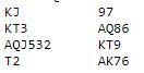 Dette er en bra slem, spesielt i ruterkontrakt, og selvsagt best om vest blir spillefører. Da er sparkombinasjonen beskyttet, og spillefører kan teste hjerteren først. Om den gir fire stikk (3-3 eller knekten dobbel) er det tolv enkle stikk, og om ikke det lykkes kan man gjette riktig i spar. Dessuten kan spar- eller hjerterutspill fra nord hjelpe deg til å kunne notere slem uten noen bekymringer.