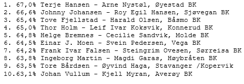 Det deltok 428 par slik at Thorleif og Stein sin plassering kvalifiserer til premie som de eneste fra oss. Nærmst på landsbasis havnet Roger og Christoffer på 67. dersom jeg ikke har blingset.