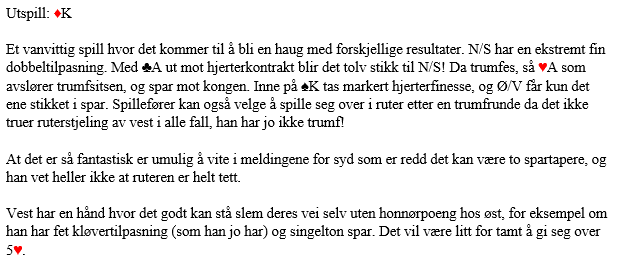 I utspill fant den uheldige engerdølen den lett defensive, men samtidig noe offensive kl-10. Denne vant spillefører på hånda før han også tok for seg den andre kløveren sin. At makker var renosn andre gang ble registrert med et lett løft med høyre øyenbryn før fem ganger ruter blir spilt.