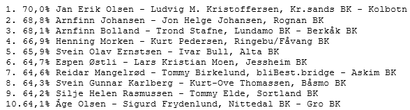 Torsdag deltok 321 par, og vi fikk årets den høyeste scoren i årets mestertreff, 70% til Jan Erik Olsen-Ludvig M. Kristoffersen, Kristiansand/Kolbotn.