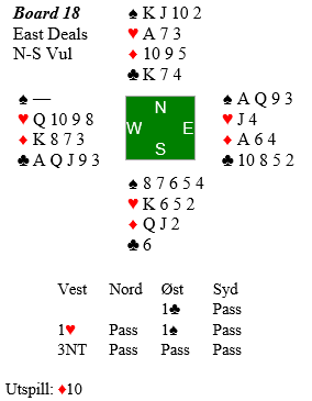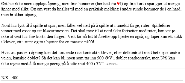 Flere par vant +400 i 3NT som antydet, og noen fikk tak i et overstikk. De ble imidlertid slått av noen 500-lapper i doblede sparkontrakter, og fire N/S par-måtte notere 800 ut på listen sin. Å vinne 3NT som Ø/V var likevel et veldig godt spill for dem som gjorde det, i underkant av 80% score!