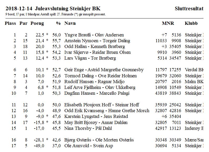 I tillegg sto flere av klubbens medlemmer for gode resultater i romjula som ikke er informert om her tidligere: I Follo julecup deltok 26 skarpskodde par og der klarte Nico m/makker en flott 4. plass, Sverre m/makker en flott 6. plass og Tore-Arne M var også godt over middels med sin 12. plass. I Romjulsbridge i Ørje deltok det 25 par og der ble det brukbare plasseringer over middels med 9. plass til Tore-Jan P og 12. plass til Kirsten-Thor. Gratulerer til dere alle