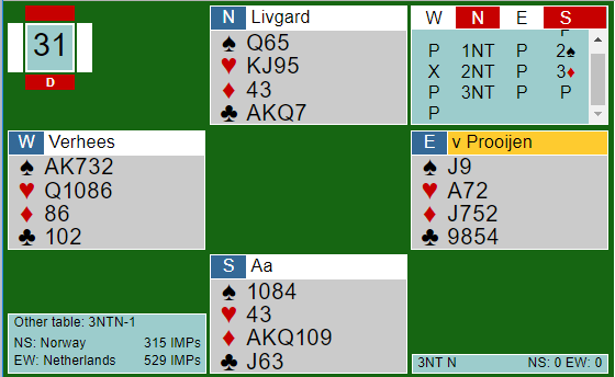Selv om det stort sett ble stryk i de fleste settene var det noen lyspunkter. Her et gladspill da Livgård-Aa sine motstandere ikke fant motspillet mot 3NT.