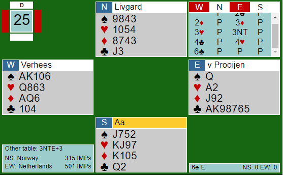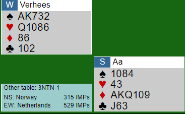 Det er en ganske hardmeldt slem som selvsagt stod som et segl, faktisk i tretten stikk. Slemmen har to sjanser. Hvis kløveren sitter 3-1 er det kløvertaper, og da må ruterfinessen gå. Her satt alt snilt, og tapt spill for Norge som spilte 3 grand med tolv stikk.