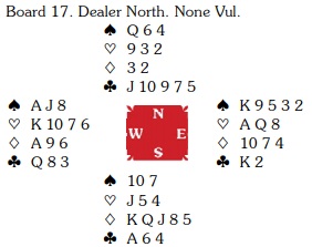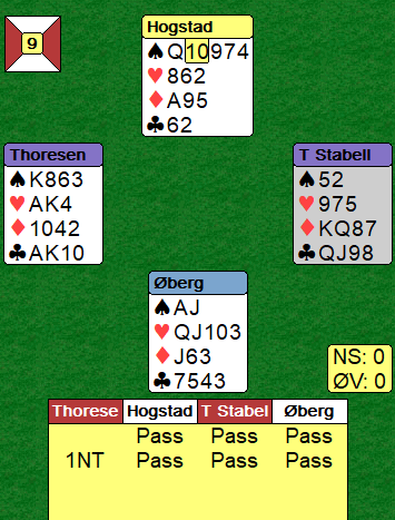 Med spar 10 ut blir det imidlertid mange stikk med riktig spill. Syd vinner med esset og spiller spar knekt. Da lasjerer vest (Thoresen gjorde det i 1NT), og nord kan ikke stikke over og fortsette fargen da det i så fall blir fra blir fra 9-7-4 rett opp i vests saks, K-8. Så syd vinner stikket, og må skifte til en annen farge, og dte blir hjerter dame. Vest vinner og spiller ruter mot bordet to ganger og får syv minorstikk med denhelgie sitsen, to stik i hjerter og spar konge, totalt ti stikk. Oslo fikk altså +180. Med liten spar ut er det umulig å vinne ni stikk i grand da nord i andre sparrunde kan stikke over og sette opp fargen sin. Forsvaret får fire sparstikk og for ruter ess. VEd det andre bordet åpnet nord med en sprek 2 spar (det er i gunstig sone). Det gikk to passer før vest sa 2NT. En slik innmelding er som en vanlig sterk grand, men ofte litt sterkere og kanskje 18 poeng.