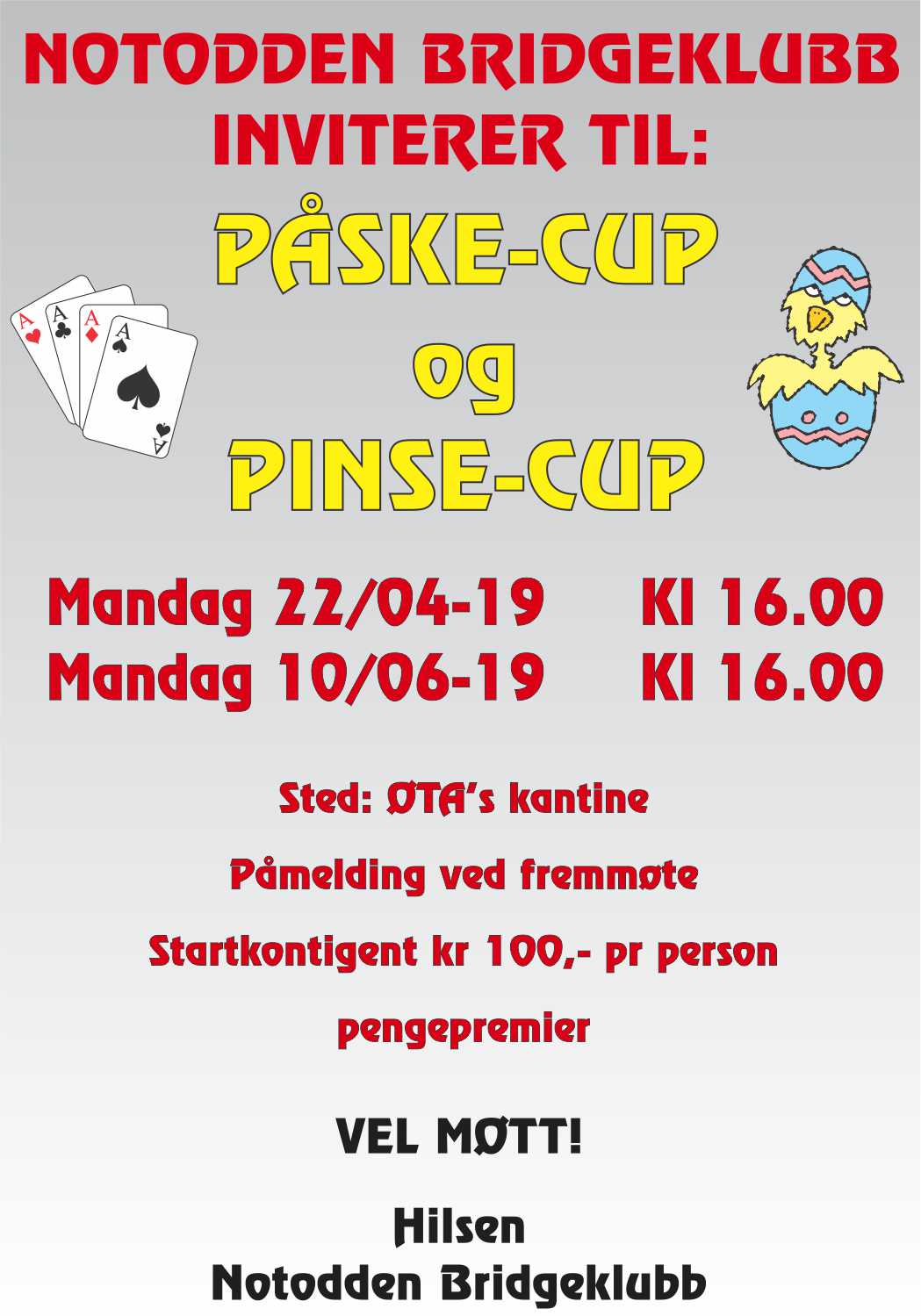 Neste tirsdag er det en enkeltkveld med spilling. Og tirsdag 23.april starter maiturneringen i klubben. VÅREN ER KOMMET!