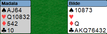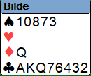 Ved begge bord meldte øst 5 kløver direkte, og ingen hadde noe å tilføye. Mot Bilde kom ruter 9 ut fra syd, og dette er hva dansken fikk se: