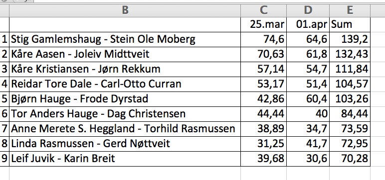 Samanlagtresultat i tabellen under. Siste kveld av KM går neste måndag. Kvelden er òg simultanturnering.