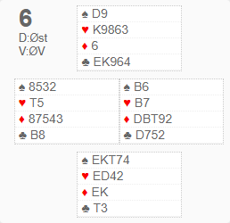 Suksessformelen var enkel og grei bridge, ingenting fancy, men svært få feil underveis. Det var om og gjort å la motparten gjøre feila istedet, og da kom poengene av seg selv. En veldig artig og hyggelig dag for undertegnede. Det var som sagt få spektakulære spill underveis, og under har jeg plukka frem et spill der det mest av alt handlet om å gjøre rett ting til rett tid: