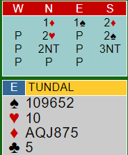 Tundal valgte å melde inn 1 spar da Michaels Cuebid for dem viser major + kløver (antar jeg). Så da ble valget å melde inn spar, eller si 2 ruter. Over østs 1 spar sa syd 2 ruter som viste hjerterfarge (overføring). Nord sa 2 hjerter, og syd meldte 2 spar - krav. Nord sa da 2 grand som syd løftet til 3 grand. Hva ville du ha spilt ut etter dette?