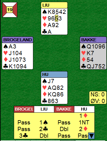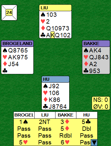 Da Brogeland-Bakke var med til 3 kløver doblet nord. Det var en opplysende dobling, men syd passet ut med sine fine motspillsverdier. Likevel, det er ikke vanlig å straffedoble motparten i delkontrakt når de har nikorts tilpasning! Etter hjerter ut fikk N/S fatt i de seks toppstikkene. Pluss 500 til Kina mot 140 var verd 8 IMP, og den kinesiske ledelsen begynte å bli ukomfortabelt stor. Etter et par gevinstspill til ledet de på et tidspunkt 70-19.