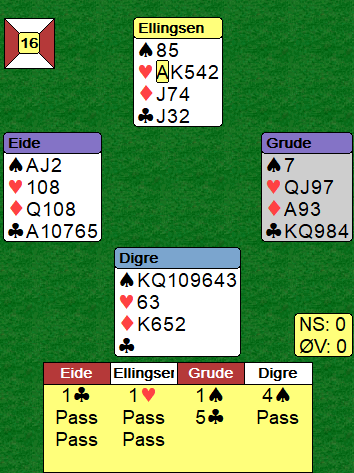 Mot Eide sin 5 kløver tok nord for A-K i hjerter før han skiftet til spar. Det ble feil, nå fikk spillefører beholde de to hjerterstikkene som ga avkast for to ruter. Med en tredje runde hjerter blir det bet, syd trumfer, og selv om spillefører trumfer over blir det bet med kun et ruteravkast på hjerter og det blir en rutertaper til slutt. Utgang i sonen mot kun 100 i beteplukk ved det andre bordet ga Studentenes BK 11 IMP.