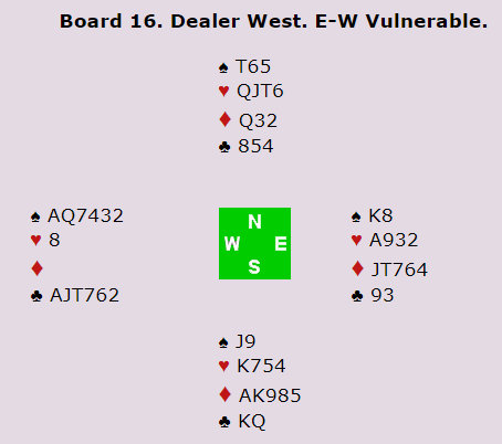 Lindqvist-Brogeland endte i 4 spar som veldig mange andre, men ble altså doblet. Der er det tolv enkle stikk slik det sitter, og av de 32 bordene var +680 for 4 spar med tolv stikk scoren ved 29 bord. Ett par spilte en veldig forsiktig delkontrakt, og ved ett bord foruten der de norske satt fikk Ø/V doblingen på seg.