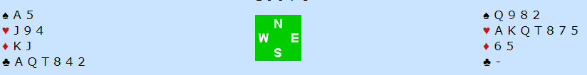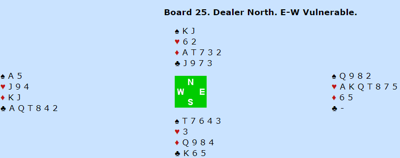 Kontrakten ble 6 hjerter spilt av øst. Hvis det kommer ruter ut er det dødt om nord har A-Q i fargen, men du forsøker vel knekten da det nok er klart større sjanse for at utspillet er fra damen enn at syd har vært kreativ og underspilt esset. Hvis det utspillet kommer og du legger knekten krever den esset hos nord. Det gjenstår imidlertid å finne parkering for tre spar. Kløverfargen må godspilles med stjelinger. Det går ganske greit med nok inntak til vest siden hele spillet så slik ut: