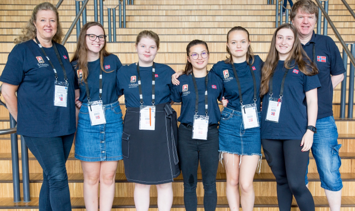 De norske jentene ligger foreløpig på en strålende tredjeplass! Fra venstre Elisabeth G. Sjødal (coach), Agnethe H. Kjensli, Ida Øberg, Thea Lucia Indrebø, Kaja Brekke, Katarina Ekren og Sven-Olai Høyland (NPC). Foto: Francesca Canali, EBL