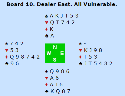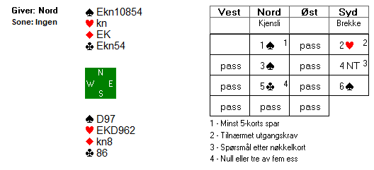 Det var altså viktig å ta av seg hjerterknekten før man spilte sparrunde nummer to. Hvis ikke får man rett og slett ikke utnyttet hjerteren til det fulle. Sagt på en annen måte blir man avhengig av hjerteren 3-3 eller eventuelt tieren dobbel for å vinne kontrakten dersom man spiller ny spar i stikk tre. Flere spillere gikk beit, blant annet nordspilleren ved det andre bordet. Dermed ble det slemsving inn for Norge og enda et bredt smil fra bursdagsbarnet Agnethe Hansen Kjensli!