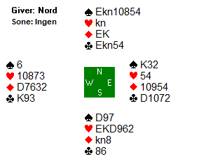 I så fall blir det fire avkast på syds minorvinnere for nords hjerter. Om syd hadde hatt kløver knekt i stedet for en av de to små kløverne, eller ruter dame i stedet for knekten ville det vært tretten enkle stikk. Det er imidlertid en annen sjanse også slik kortene faktisk så ut, SKVIS!