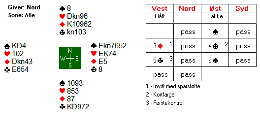 La oss si du havner i 6 spar på østs hånd uten innblanding fra motparten, og får ruter 8 (norsk fordeling) ut fra syd. Hvordan planlegger du spilleføringa?
