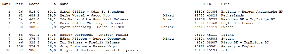 I MSIBT (Sveaas-turneringen) deltar 125 par, flere av dem utenlandske. Best ut første dag kom Odin Svendsen sammen med engelske Simon Gillis foran et nederlandsk par, og vi merker oss Gunn Helness-Ida Wennevold på 3.plass. Men også i den turneringen er det nettopp startet, og de avslutter på søndag.