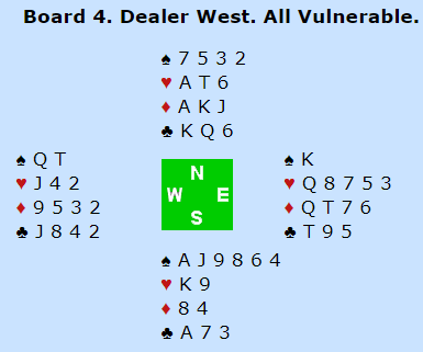 Merk at det er en safevariant i trumf her, hvis trumfen sitter litt annerledes i mot. Det bør spilles liten til knekten hvis øst følger med spar 10 i første runde. Her kommer kongen på og det er ingen problemer, men hvis øst hadde fulgt på med tieren er riktig spill å legge knekten. Om vest kan stikke den sitter fargen 2-1, ingen problemer, og ekstrasjansen spillefører får med seg er at øst har K-Q-10, altså alle trumfene på den siden. Har han det hjelper det ikke motspilleren å legge i en stor trumf i fargens første, tvert om, det hjelper spillefører som kanskje kan overse safevarianten om øst følger med tieren. Sånn som det satt var det ingen problemer i spillet, tolv enkle stikk, men det var problemer i meldingene.
