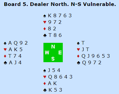 Da spillet forekom der jeg så på (BBO) stakk vest opp med esset. Han hadde oppdaget ett poeng, men oversett ett annet. Det han hadde fått med seg var at spar 9 var blitt et veldig stort kort. Nord har kun kongen som er større, og om nord har den andre ruterhonnøren er det helt trygt å stikke med spar ess og spille ruter for å sette opp fargen. Spar 9-2 er da en sikker stopper så lenge altså nord kommer inn.
