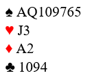 Joda, du har kanskje gjettet det når du får det presentert slik. Hvis vi har syv sparstikk som er sannsynlig, og du har selv ruter ess, så er det mange veldig mange stikk her? Det står neppe i 4 spar, men 3 grand kan godt være nedlegg? Makker behøver bare ett stikk til deg utenom den sparkongen du vet om. Motparten ser ikke så ivrige ut med hensyn til hjerterfargen, så den er antagelig ufarlig, og det kommer mest sannsynlig ruter ut.