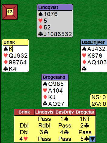 Nords redobling da 1 grand ble straffedoblet ba syd om å melde kløver. Meldingene fortsatte slik opp til 5 kløver fra Brogeland, sannelig sjelden at han som har sterk grandåpning stamper mot motpartens utgang 4 i major!