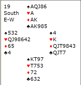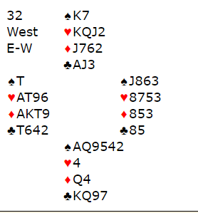 Høyland-Ekren var i 6 grand med øst som spillefører. Noe avhenger av utspillet. Hvis motparten spiller spar ut og det sitter slik at de får etablert ett stikk der må spillefører spille på at sparen gir tre stikk. Da kan det kanskje bli tolv med tre sparstikk, fire hjerterstikk, tre ruterstikk og 2 i kløver. Det er også en liten tilleggsjanse at en motspiller har Q-J dobbel i kløver, og det vil også være skvismuligheter i dette spillet.