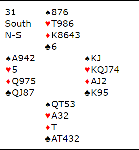 Kendrick åpnet med 1 kløver, pass, 1 ruter, og Ole Marius Myrvold (øst) doblet (det står feil lagoppstilling på resultatsiden). Kendrick sa 1 spar, og Terje Lie doblet som for dem viser spar og bra verdier, som du skal se er det akkurat hva han hadde. Det gikk to passer. Hva ville du gjort nå?