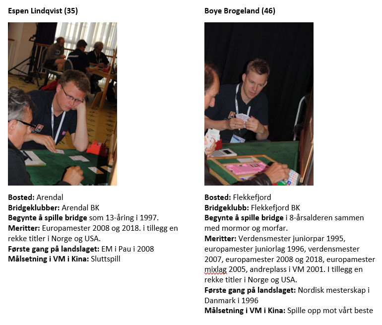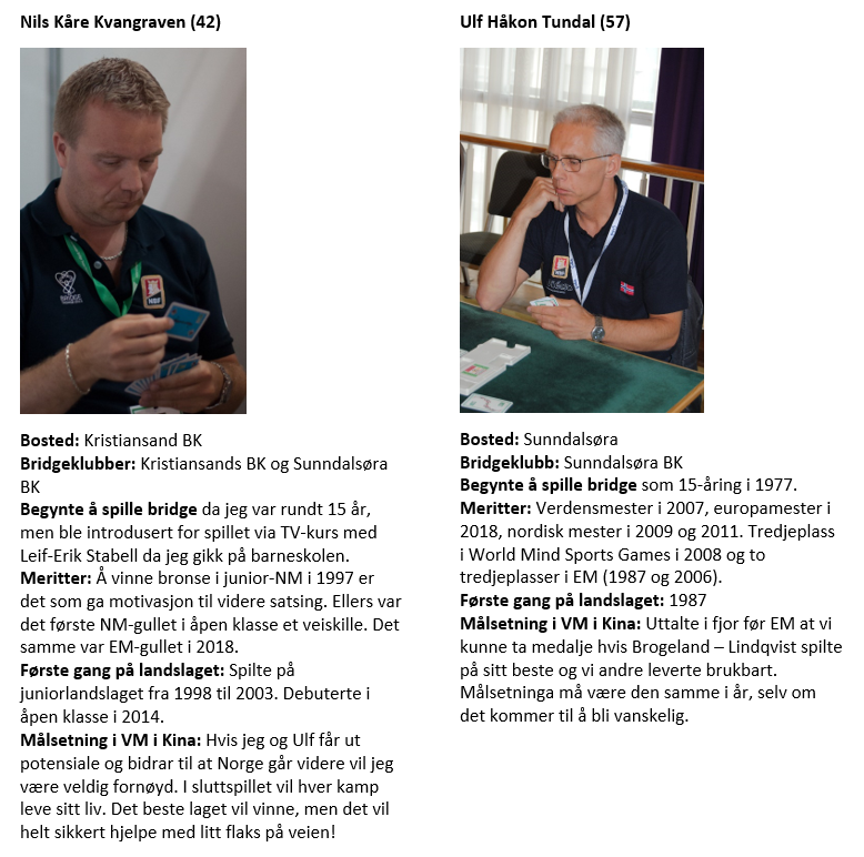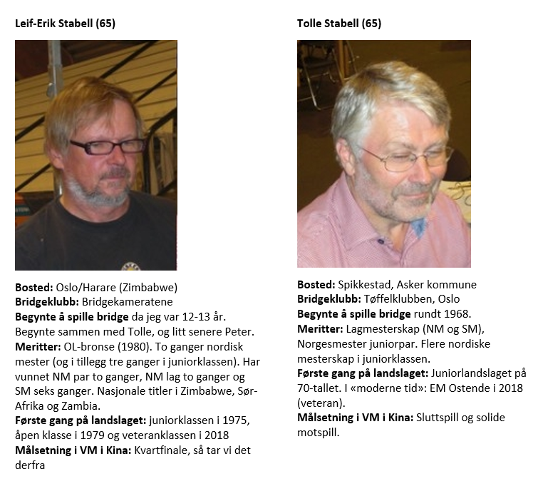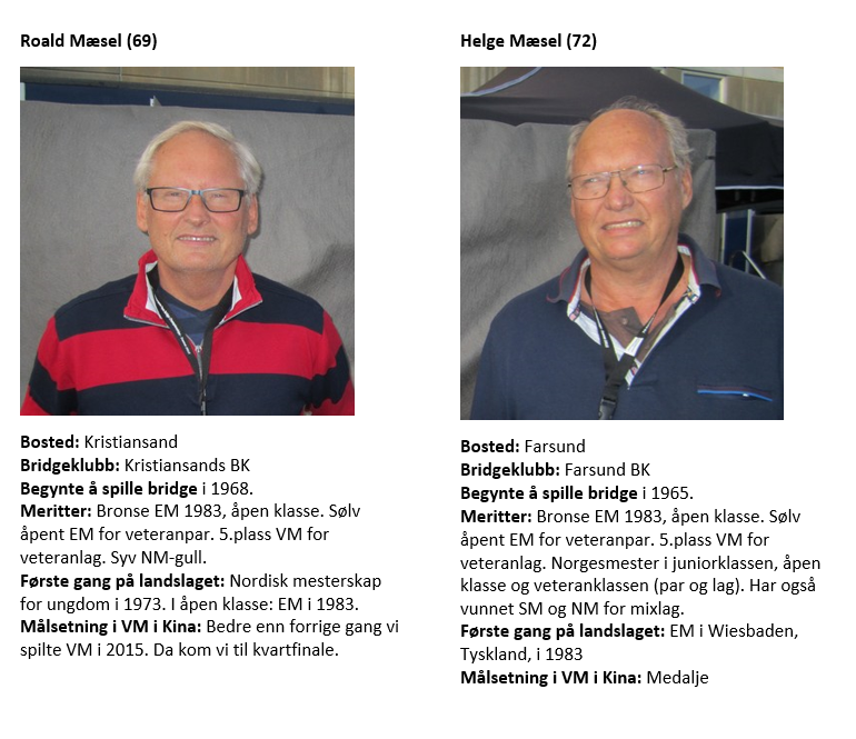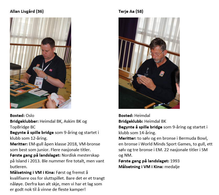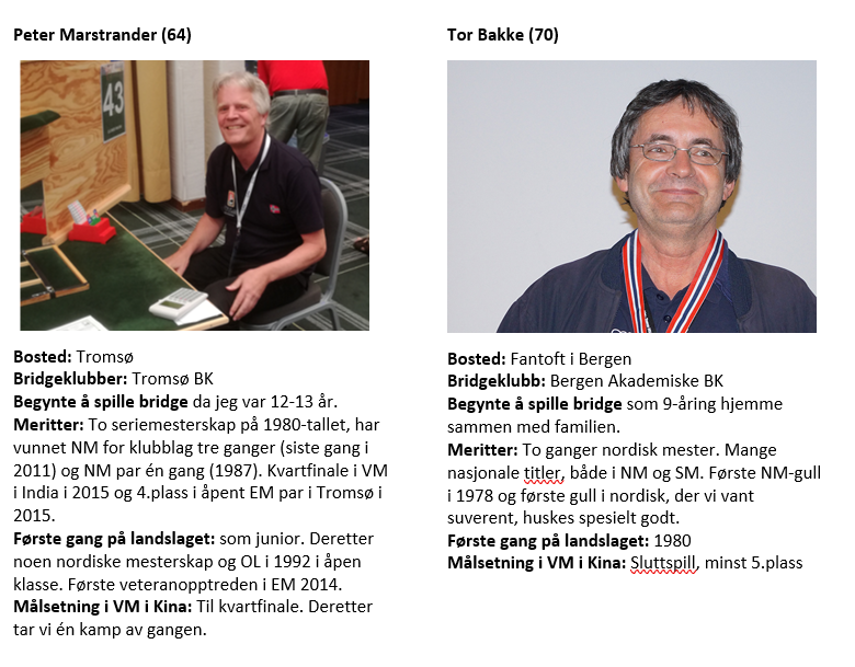 Norges lag i veteranklassen i VM i Kina er som følger: