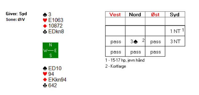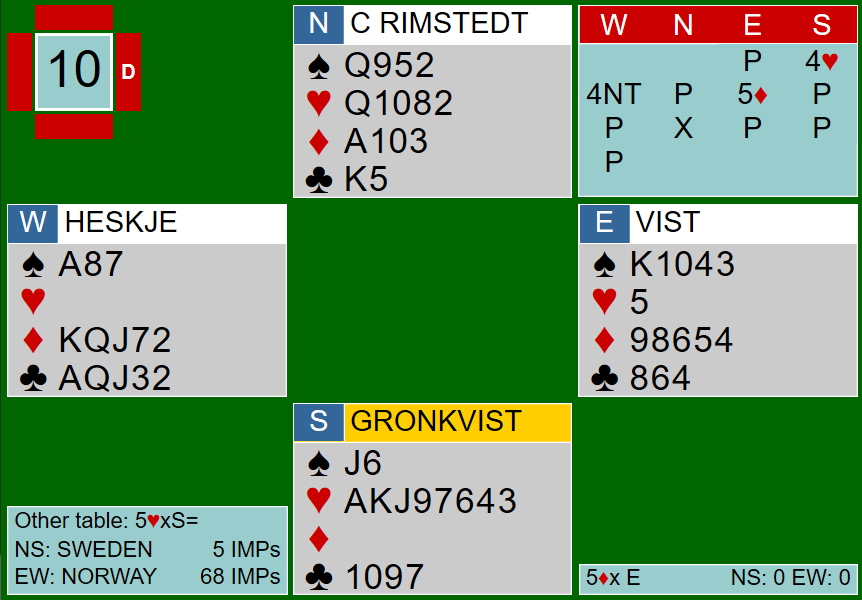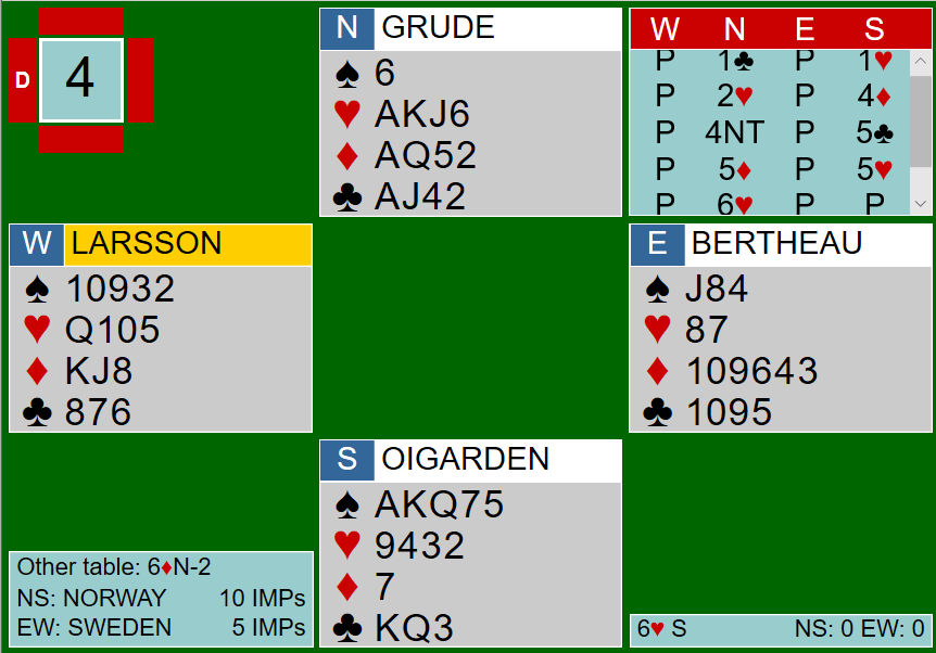 Det er på sin plass å informere om at de norske navnene i diagrammet er feil. På BBO var Vist - Heskje lagt inn øst vest, mens Grude - Øigarden var plassert nord-syd. I realiteten var det motsatt. Ved det aktuelle bordet satt Liv Marit Grude i øst og Bodil Nyheim Øigarden i vest.