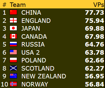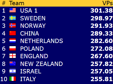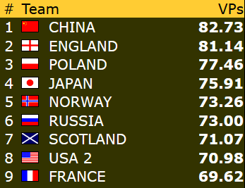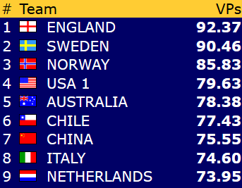 Med få spill igjen er GeO Tislevoll og New Zealand opp på 8.plass på bekostning av Italia og Israel: