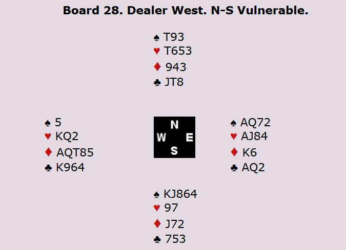 Mot Terje Aa (V)- Allan Livgård (Ø) meldte svenskene Rimstedt (O. i N og M. i S) slik: 1 NT fra Syd, 2 kløversøk (Stayman) fra Nord og svar 2 hjerter fra Syd. 3 kløver fra Nord var trolig gjentatt søk og svaret 3 NT lovte dermed 2-4 i major. Da Nord så meldte 4 ruter var det klar sleminvitt og Syd cue- bidet 4 hjerter (1./2. kontroll) før Nord brukte 5 ess Blackwood og da svaret 5 kløver kom kunne Nord avslutte med 6 grand. Det er den beste kontrakten som alltid vinnes. Hva skjedde så ved det andre bordet der Boye Brogeland (Syd)- Espen Lingqvist (Nord) møtte svenskene Nystrøm (V)- Upmark (Ø)? Jo det startet med 1 NT fra Syd og svar 3 kløver (alertert) fra Nord som var en spesialkonvensjon og 3 ruter fra Syd. Før 3 NT og 4 ruter fartsatte trumfen. Etter 5-ess BW- søk ble bare 4 ess avdekket og kontrakten derfor lagt i 6 ruter. Bra det også- men ikke i dette tilfellet. Hvorfor? Jo hj 9 kom ut til Øst sitt ess og så ny hjerter som Vest kunne stjele. Hjerterfargen satt virkelig 5-1 imot og en sonebet mot 1440 ut ved det andre bordet kostet nordmennene 17 imp. Sverige vant kampen 87-21.