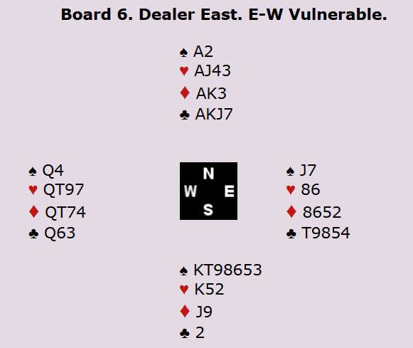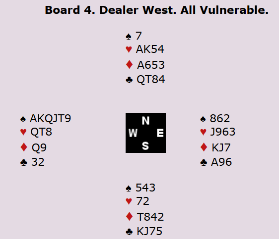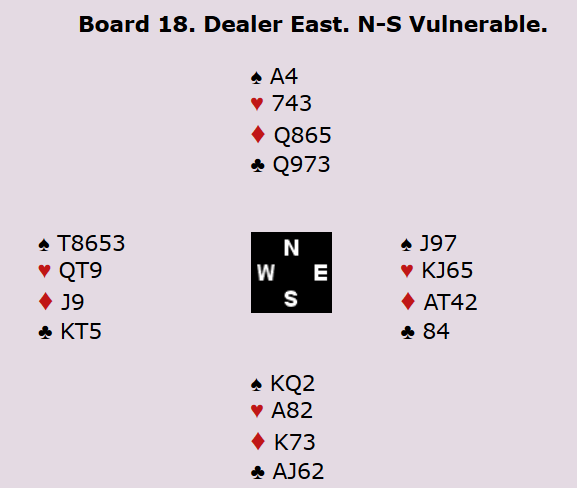 I utgangspunktet er det elleve stikk i spar øst-vest. Det er én taper i hjerter og én i ruter. Man får kastet en ruter i øst på det siste kløverstikket, men det er fortsatt en rutertaper man ikke blir kvitt. Imidlertid er det essensielt at motspillerne får med seg hjerterstikket for å holde nede på elleve stikk.